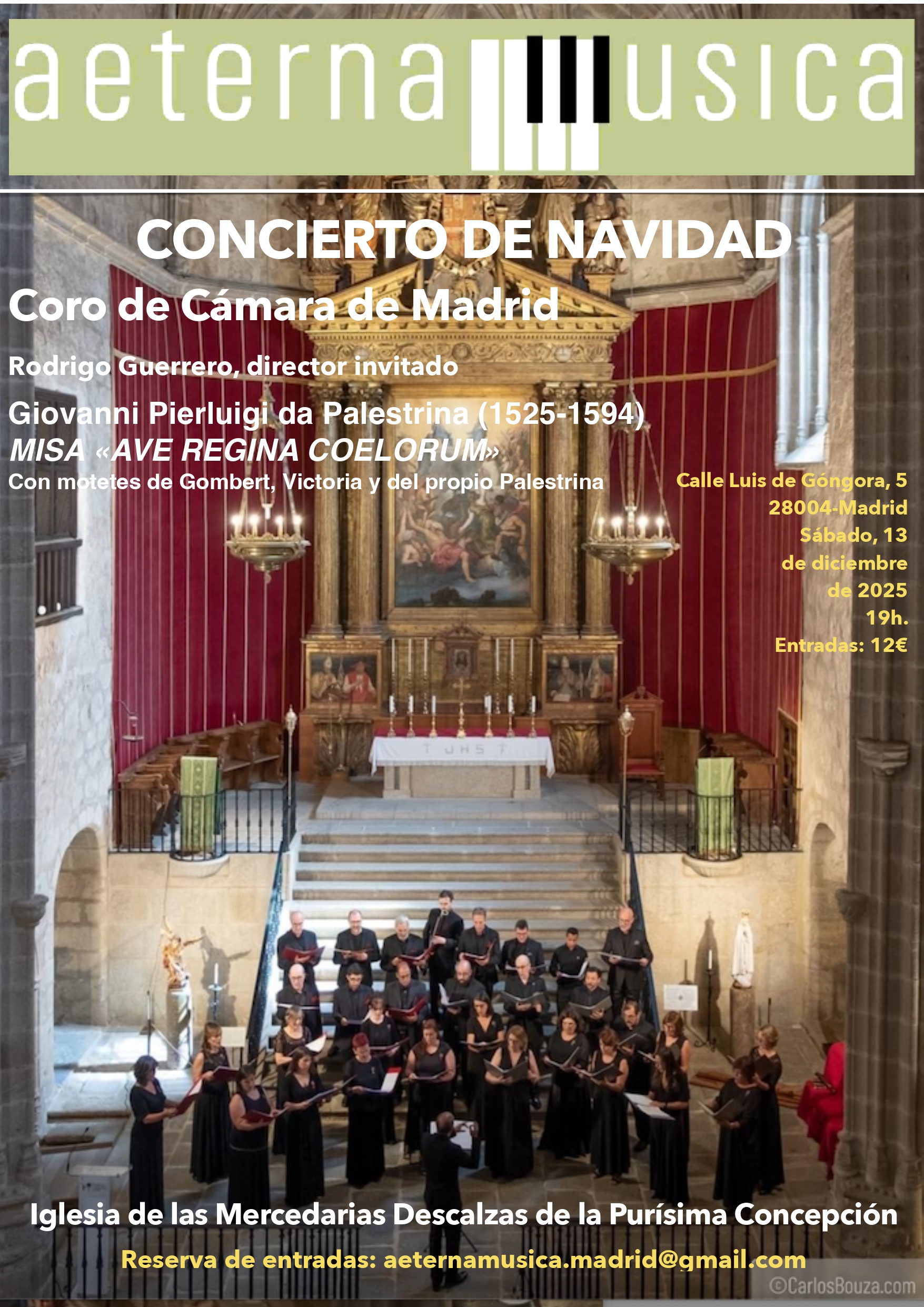 El Coro de Cámara de Madrid, dirigido en esta ocasión por Rodrigo Guerrero como director invitado, nos ofrecerá un programa titulado Palestrina en su 500.º aniversario: el clasicismo de la polifonía renacentista en el que se interpretará la Misa «Ave Regina Coelorum» de Giovanni Pierluigi da Palestrina junto con motetes de Nicolás Gombert, Tomás Luis de Victoria y del propio Palestrina.
