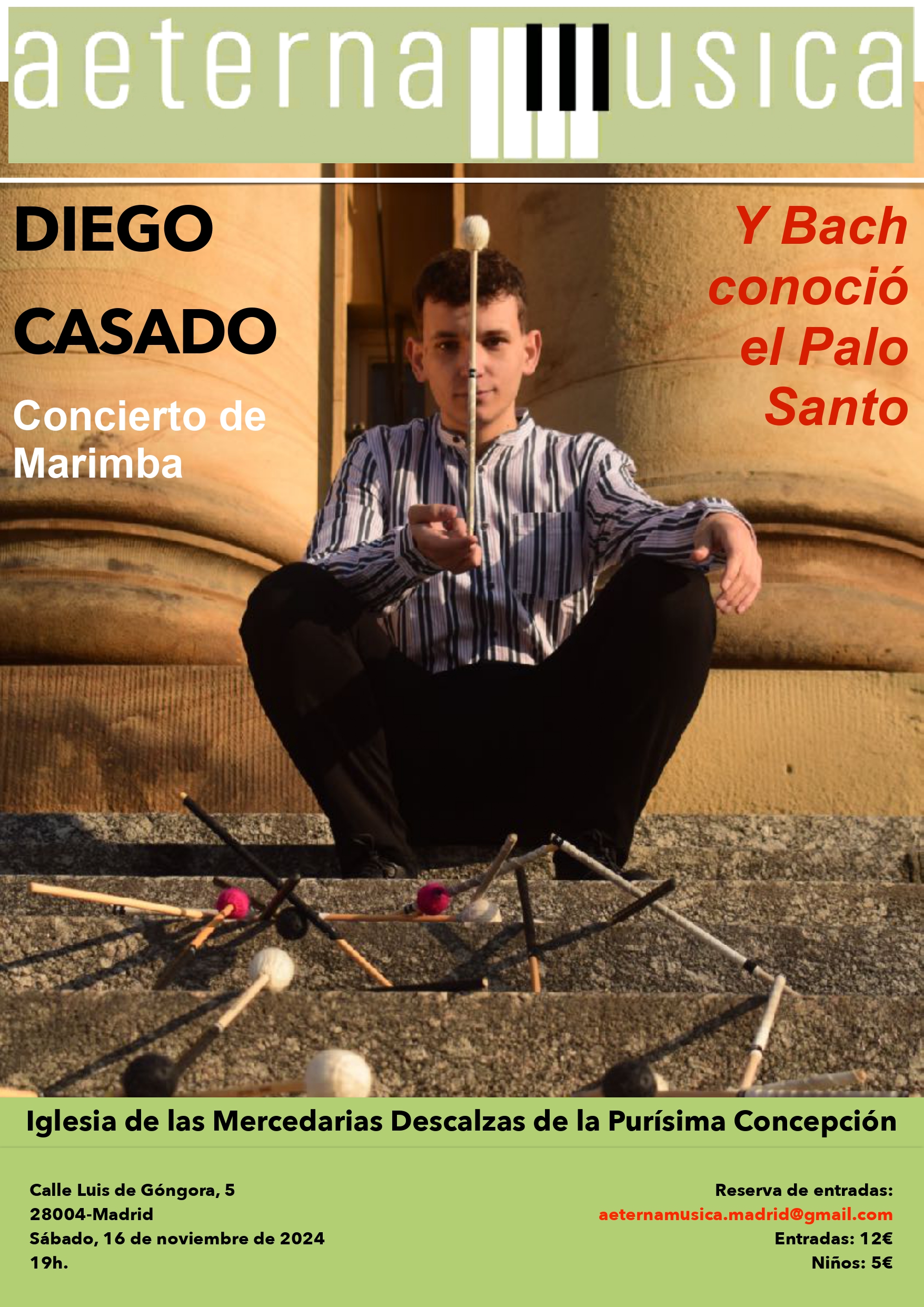 En este concierto presentamos al percusionista Diego Casado, quien nos ofrecerá la oportunidad de conocer el instrumento que se ha convertido en su compañero inseparable, la marimba, a través de obras de Johan Sebastian Bach, Jacob Druckman, Csaba Zoltán Marján e Isaac Albéniz.